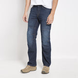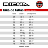 Pantalón de jeans reforzado con fibra dupont kevlar, protectores ajustables d30 en rodillas, corte recto.