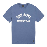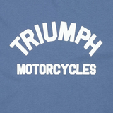 La camiseta Triumph Burnham Powder Blue es una camiseta de algodón en color Azul azabache con estilizadas letras Triumph Motorcycles arqueadas con pigmentos suaves en color hueso en el pecho y una nueva insignia tejida con la marca Triumph en el dobladillo inferior.