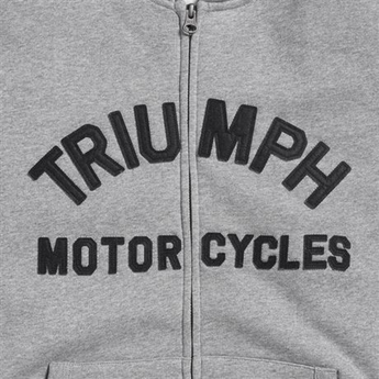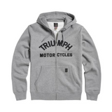 Sudadera con capucha de algodón de felpa gruesa en gris con letras arqueadas de Triumph Motorcycles, cremallera frontal completa, bolsillos canguro dobles y cordón ajustable en la capucha.