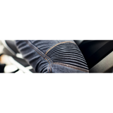 Jeans para moto de mujer de corte slim, tejido resistente y ligeramente elásticos. Muy cómodos. Reforzados con doble costura . Con el interior reforzado de Kevlar de 270 g. en las zonas de mayor desgaste. Extremadamente resistentes al corte ya la abrasión. Bolsillos para las protecciones de caderas y rodillas con velcro para regular su posición. Fuelles en las rodillas y cintura para una mayor comodidad. Con protecciones de PU en rodillas y cadera (CE EN1621-1:2012) con bolsa incluida