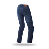 Jeans para moto de mujer de corte regular, tejido resistente y ligeramente elásticos. Muy cómodos. Reforzados con doble costura. Con el interior reforzado de Kevlar de 270 g. en las zonas de mayor desgaste . Extremadamente resistentes al corte y a la abrasión. Bolsillos para las protecciones de caderas y rodillas con velcro para regular su posición. Con protecciones de PU en rodillas y cadera (CE EN1621-1:2012) con bolsa incluida